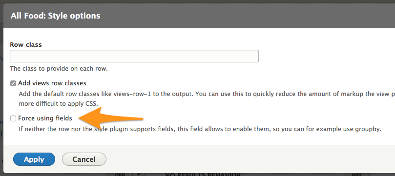 After hitting Apply once to save the "Force using fields" setting, I see the option to group by fields (after you've added some to the view, of course).