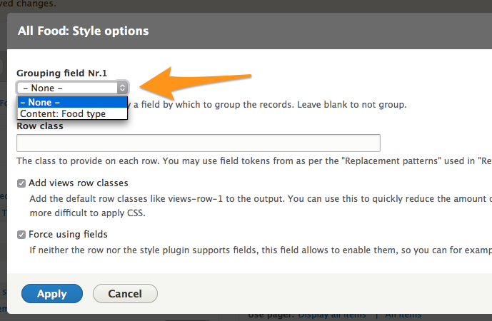 After hitting Apply once to save the "Force using fields" setting, I see the option to group by fields (after you've added some to the view, of course).